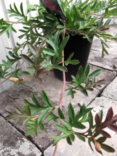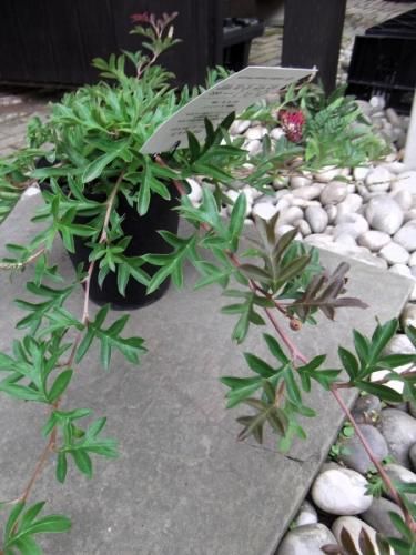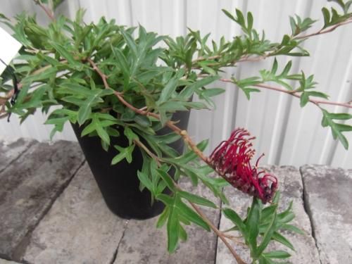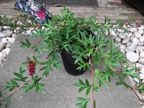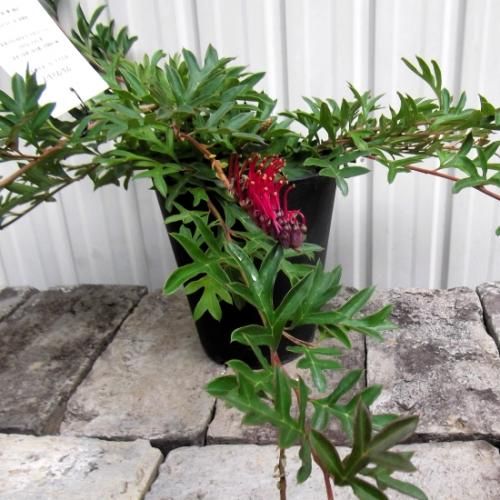 グレビレアはオーストラリアを中心に250種以上ある常緑低木です。商品は切れ込みの深い形の葉で幼葉が赤く色づきます。這性の品種でグランドカバーに向ています。春に鮮やかな赤色の個性的な形の花を咲かせます。