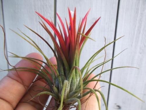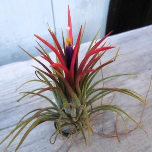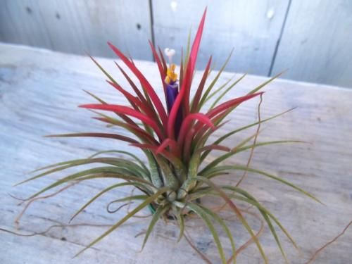 チランジアは土で植えなくても育つため、エアープランツと呼ばれます。イオナンタは薄緑色に銀灰色の鱗片をもち、開花期には中心が赤くなり、舌状をした紫色の花弁が咲きます。側芽をたくさん作ります。「フエゴ」は炎や火山を意味するスペイン語から名づけられました。開花の前に真っ赤に染まる品種です。