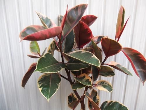インドゴムの枝代わり種です。斑入りの葉がピンクがかるのが特徴です。特に幼葉は赤く色づき綺麗です。他のゴムノキ同様に丈夫で育てやすい観葉植物です。