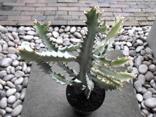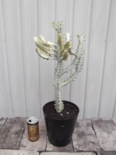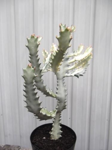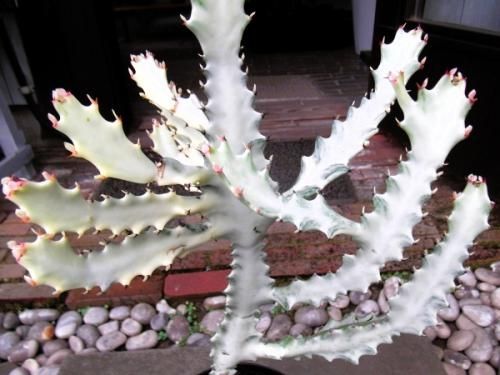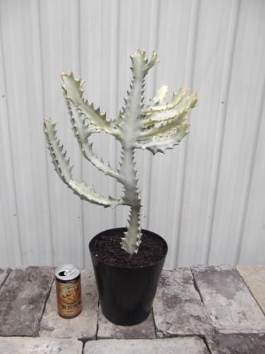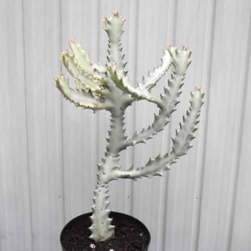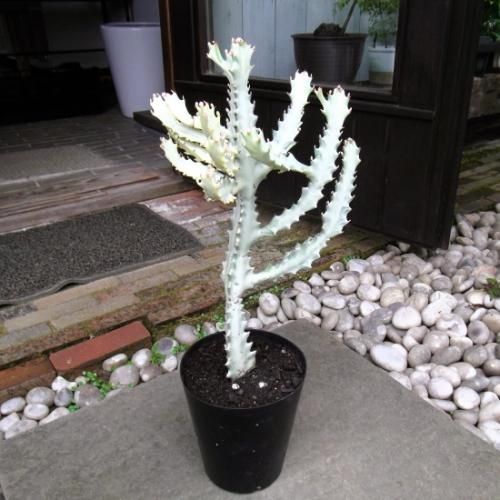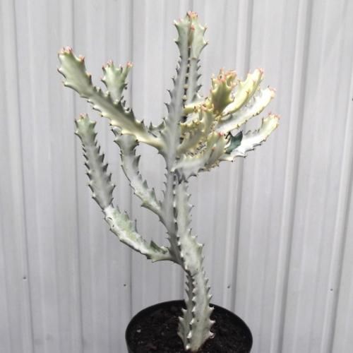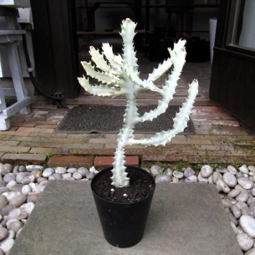 ユーフォルビア属のラクテアは、原産地では樹高5m程度にまで成長します。3〜4の稜があり、各稜上には鋭く硬質の刺状突起を有します。商品は茎の表面のほぼ全体が白色に見える希少種です。