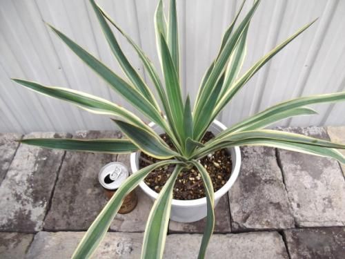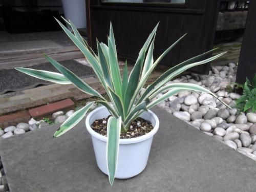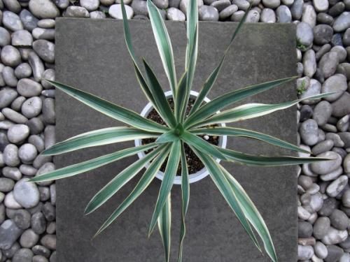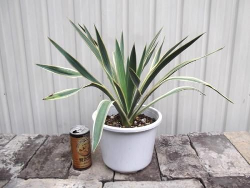 クリーム色の斑が入る剣状葉は硬くて厚く先端は鋭くとがっています。耐寒性があり庭園樹にも向いています。晩夏から秋にベル状の白い花を咲かせます。寒さにあたると葉の斑の部分が赤みがかってカラフルな色あいになります。