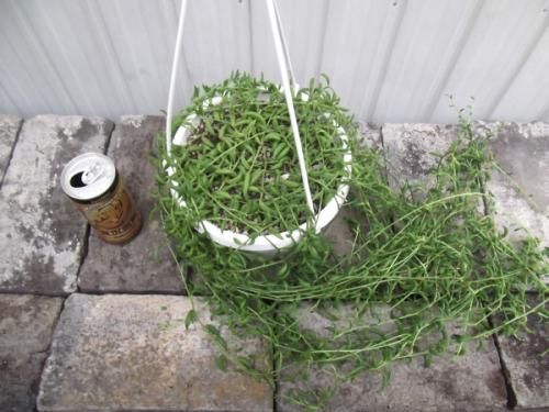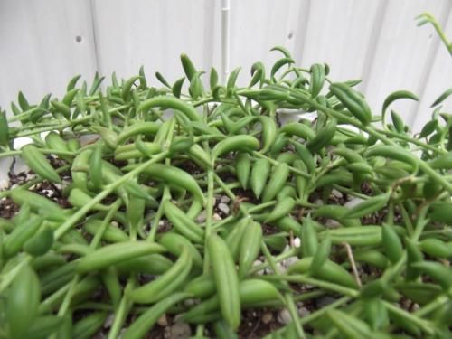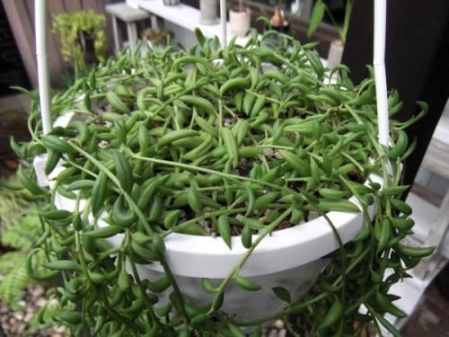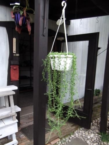 グリーンネックレスに似ていますが、葉は先の尖った楕円形です。ハンギングや高さのある鉢に植えて、垂れさがった姿を観賞する観葉植物です。