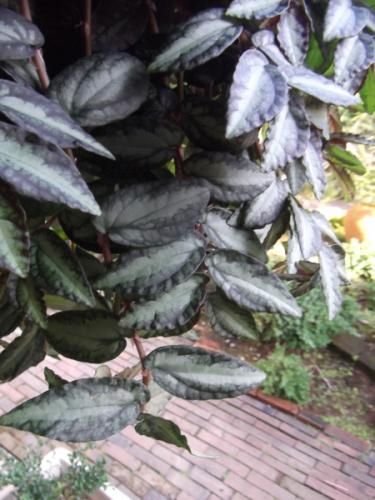 ほふく性の多年草で、やや厚くしっかりした斑入りの葉を茂らせ、茎を30〜60cmほどに伸ばします。赤みのある茎に暗青緑色に淡緑色の斑が入る葉を茂らせます。エキゾチックな雰囲気です。茶色の花を開花させるときに煙のように花粉を散らせることからハナビソウとも呼ばれます。