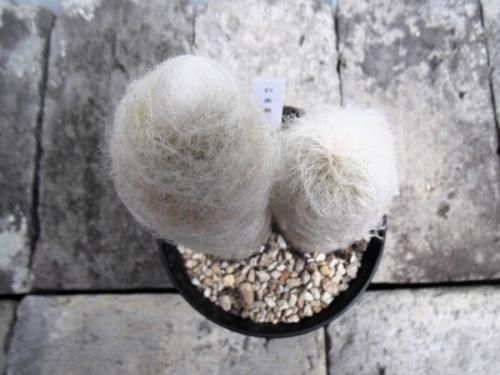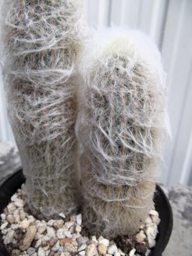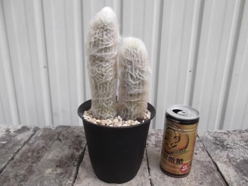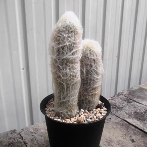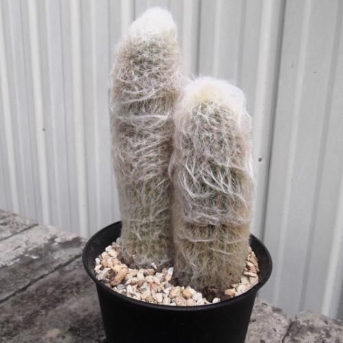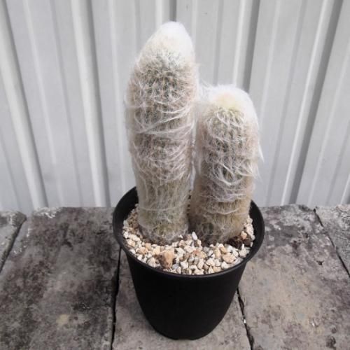 柱サボテンの一種で、白く長い毛に覆われた個性的な姿です。