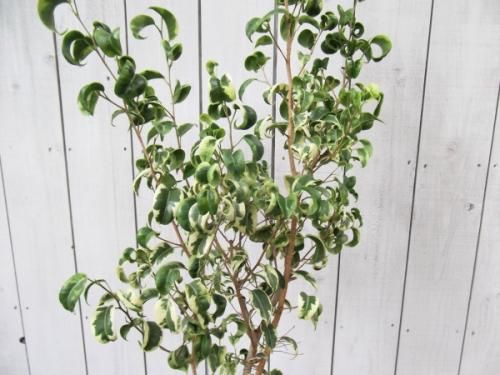 フィカス・ベンジャミナの新品種で、カールした形の葉が特徴です。似た品種でバロックがありますが、こちらのほうが葉がやや大きめでカールが弱めです。商品は斑入り葉の品種で、明るい雰囲気です。