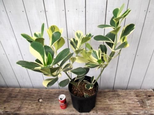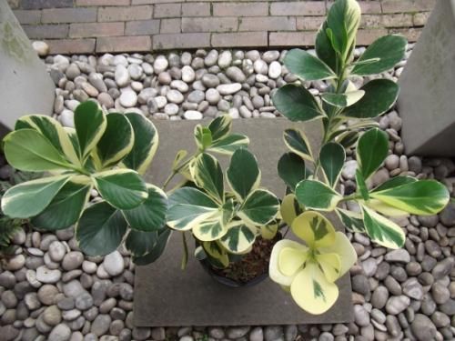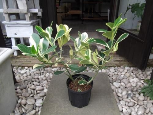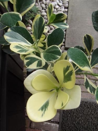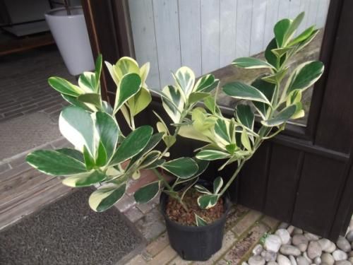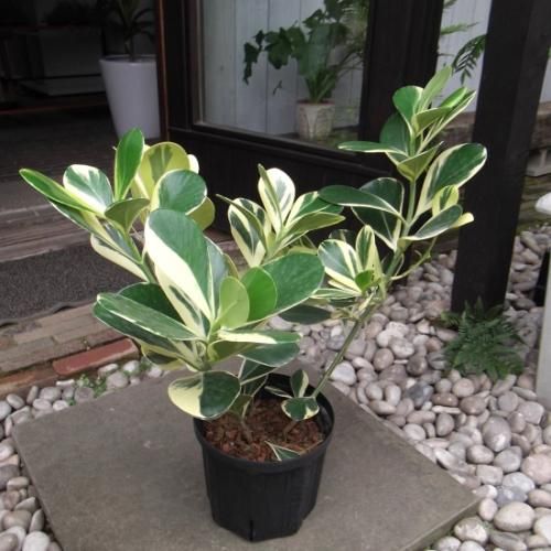 丸みのある形の明るい緑色の葉は肉厚で光沢があり枝に対生する。ゴムノキに姿が似ていますが分類上はまったく違う植物です。成長すると白とピンク色の花が咲き実が成ります。商品は黄斑が入る明るい葉で鑑賞価値の高い品種です。