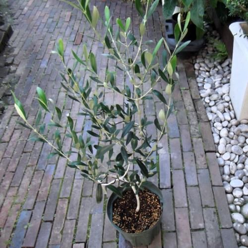 オリーブは地中海地域で果樹として広く栽培されています。日本では庭のシンボルツリー、最近では観葉植物として人気があります。商品は直立型の樹形で葉は大きめで先が尖った形の銀葉系です。美しい葉色と豊富な花粉量が特徴の品種です。