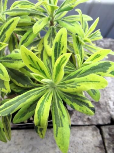 ユーフォルビアは、地中海沿岸の乾燥した斜面や松林に自生する耐寒性常緑多年草です。個性的な花と存在感のある草姿が人気です。ゴールデンレインボウは、マーティニーの園芸種で黄色の斑が入る明るい色の葉です。冬には斑入りの部分が赤く色づきます。赤色の中心(ハナ)に緑色の苞葉の花が咲きます。