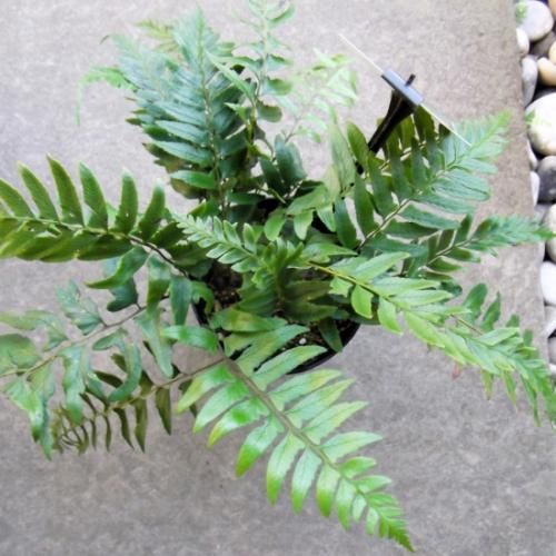 福島県以南〜九州の林下の湿った所に生える。葉柄は緑色〜暗紫色、基部鱗片は広披針形で褐色。葉身は1回羽状複葉。側羽片は10〜20対、下部では有柄で上部に向けてしだいに小さくなり、頂羽片はない。側羽片の辺縁は鋭鋸歯状で、基部上側は耳状になり、葉脈部分はくぼむ。ソーラスは線形で中肋寄りにつく。