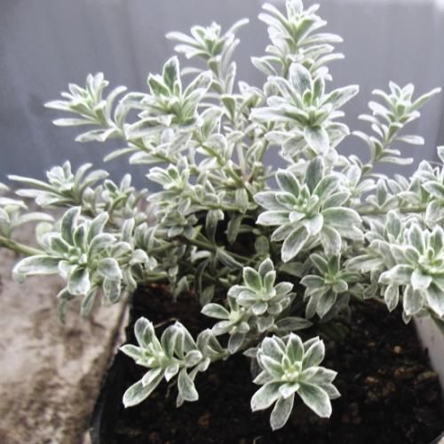 ローズマリーに葉と花が似ていますが芳香はありません。春から初夏にかけて長い期間咲く花は清楚でかわいらしい。商品は、白花の四季咲き性、花は少なめで成長はゆっくり。横に広がるタイプです。