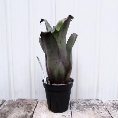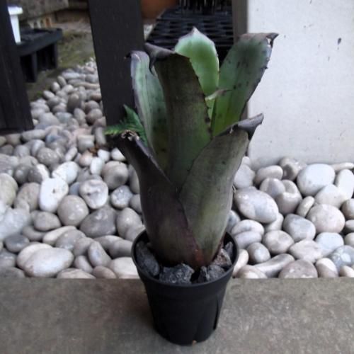 ホヘンベルギアはブラジルからカリブ海沿岸にかけて分布するタンクプロメリアです。スッキリ細めのビルベルギア比べて株元が膨らみズングリした姿です。商品はどっしりした壺型で葉色が濃いグリーンです。強光で育てると黒紫色に染まります。