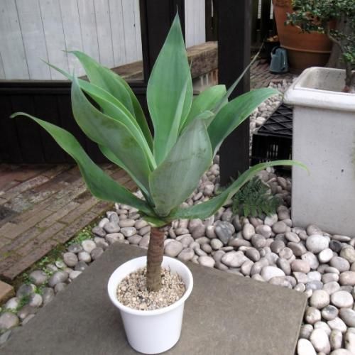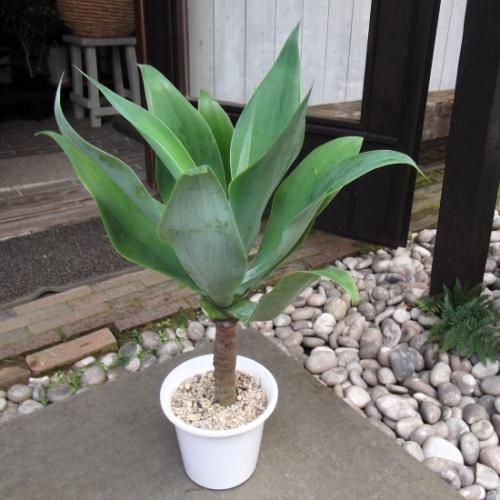 白粉がかかった淡いグリーンの葉を花のように広げます。他のアガベに比べて軟らかい葉です。成長とともに幹が上がり、頂上部に葉を広げる姿はスタイリッシュで存在感があります。