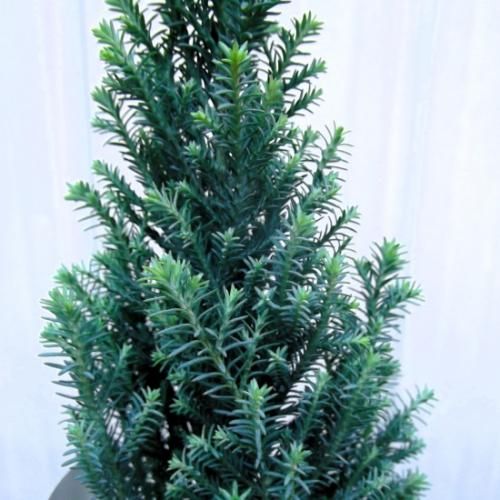 葉が全体的に青緑色の落ち着いた葉色をしています。樹形は円錐形もしくは円柱形に成長する。成長が年間約20cmと非常に緩やかで、高さ約120cm程度までしかならないので鉢植え、庭植えに向いています。